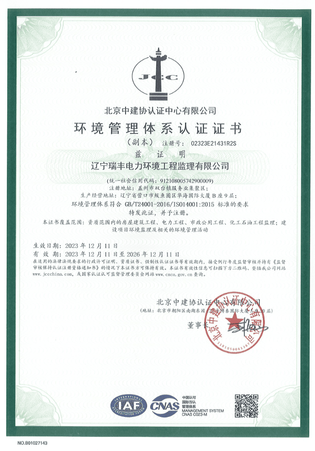 環(huán)境管理體系認(rèn)證證書(shū)2023-